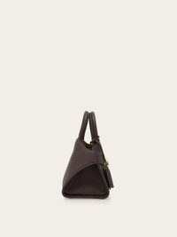 Two-tone iteration of the Ferragamo Hug bag, a new contemporary icon made of hammered calfskin, vegetable dyed and tumbled for a rich, pebbled finish. The silhouette features an asymmetrical back panel that wraps around to ‘hug’ the front one via two wide leather straps with custom golden Gancini clasps. It fastens on the inside with a metallic ring, the lined interior features a zip pocket, and a tonal leather fob is placed on the rigid top handle. Rectangular foot studs protect the base and confirm her iconic status. - height 5.5 IN length 8.8 IN width 4.3 IN - Composition: hammered calfskin - Made in ITALY - Product code: 215975 778490