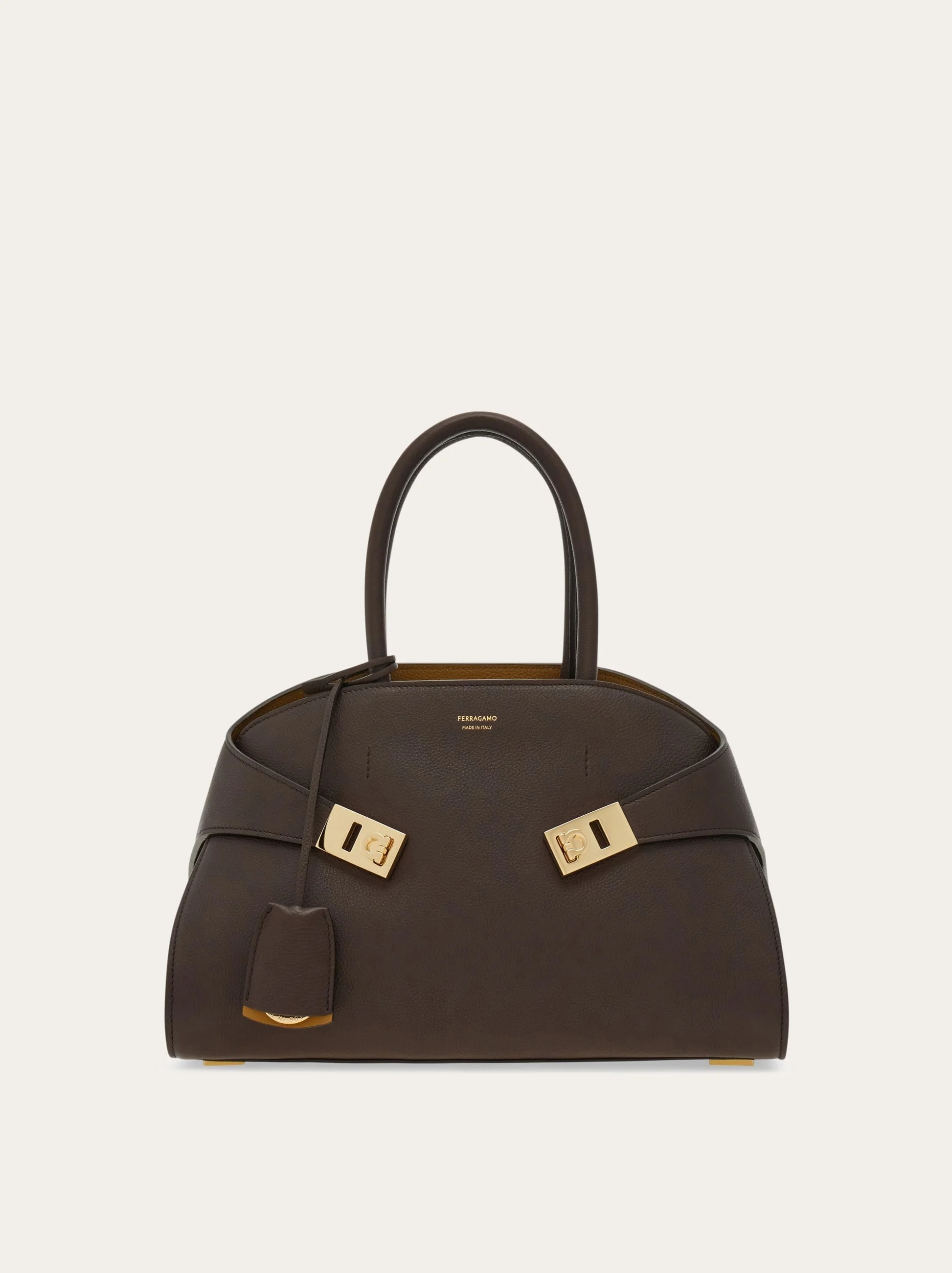 Two-tone iteration of the Ferragamo Hug bag, a new contemporary icon made of hammered calfskin, vegetable dyed and tumbled for a rich, pebbled finish. The silhouette features an asymmetrical back panel that wraps around to ‘hug’ the front one via two wide leather straps with custom golden Gancini clasps. It fastens on the inside with a metallic ring, the lined interior features a zip pocket, and a tonal leather fob is placed on the rigid top handle. Rectangular foot studs protect the base and confirm her iconic status. - A) Height 8.6 IN B) Length 12.4 IN C) Width 7.4 IN - Composition: hammered calfskin - Handle drop: 5.5 in/14 cm - Medium - Made in ITALY - Product code: 215608 777524