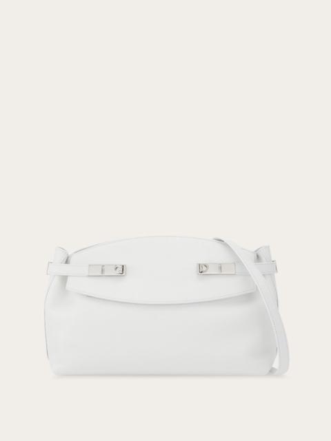 Soft and enveloping with metropolitan lines: the new Ferragamo pouch is the evolution of the crossbody bag from the new Hug line, crafted from soft natural-grain calfskin. The deconstructed construction with side straps creates delicate gathering, for a “hug” effect. The Gancini buckles fasten on the front flap, covering the functional zipped pocket. The spacious lined interior is perfect for holding your personal items. Carry it as a handbag or crossbody bag with the adjustable leather strap. - height 9.0 IN length 12.5 IN width 7.0 IN - Composition: calfskin - Made in ITALY - Product code: 215890 766672