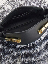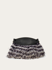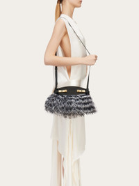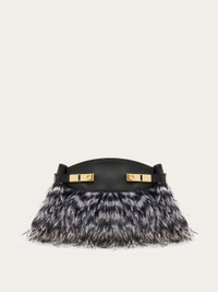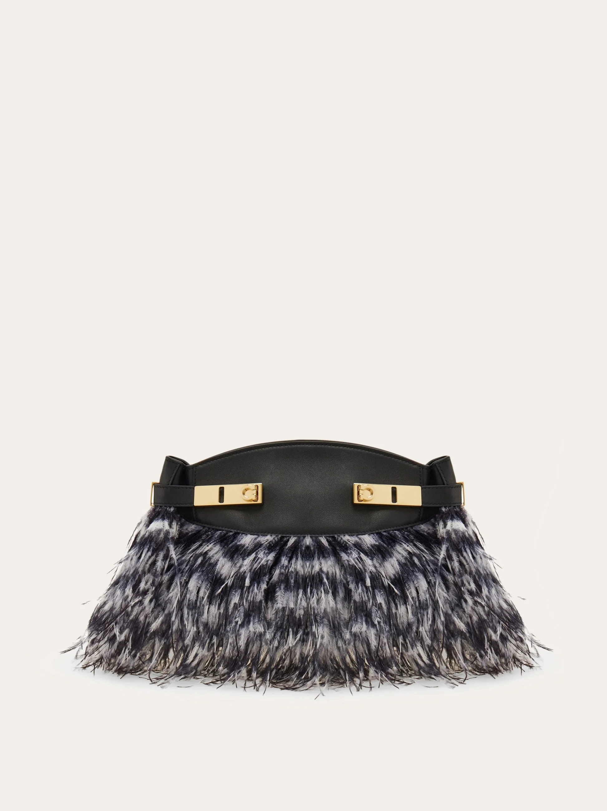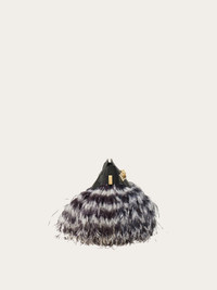 Sumptuously soft with an elegant flounce, the Ferragamo Hug, perfect for cocktail hour. Made from a combination of vegetable dyed calfskin and ostrich feathers, both printed and applied by hand, this precious accessory is the last word in high octane glamour. The soft silhouette is cinched at the sides by slim straps that ‘Hug’ the body and fasten at the front with golden Gancini buckles. A magnetic clasp opens to an organized interior with two card slots, and a removable shoulder strap offers a hands free option. - A) Height 5.9 IN B) Length 9.4 IN C) Width 4.7 IN - Composition: calfskin and ostrich feather - Extra Small - Made in ITALY - Product code: 219842 777402