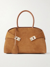 Ferragamo’s chic tote is named for the 'Gancini' tabs that 'hug' the sides. This small version has been made in Italy from ribbed suede and has an internal zipped pocket and detachable leather shoulder strap. It'll hold your phone, paperback and wallet. Details & Care - Camel leather and suede (Lamb) - Two top handles, adjustable detachable shoulder strap - Internal zipped pocket - Fully lined - T-bar fastening at open top - Comes with dust bag