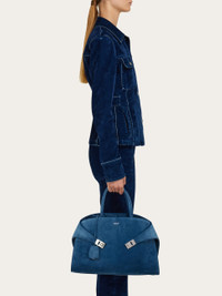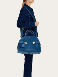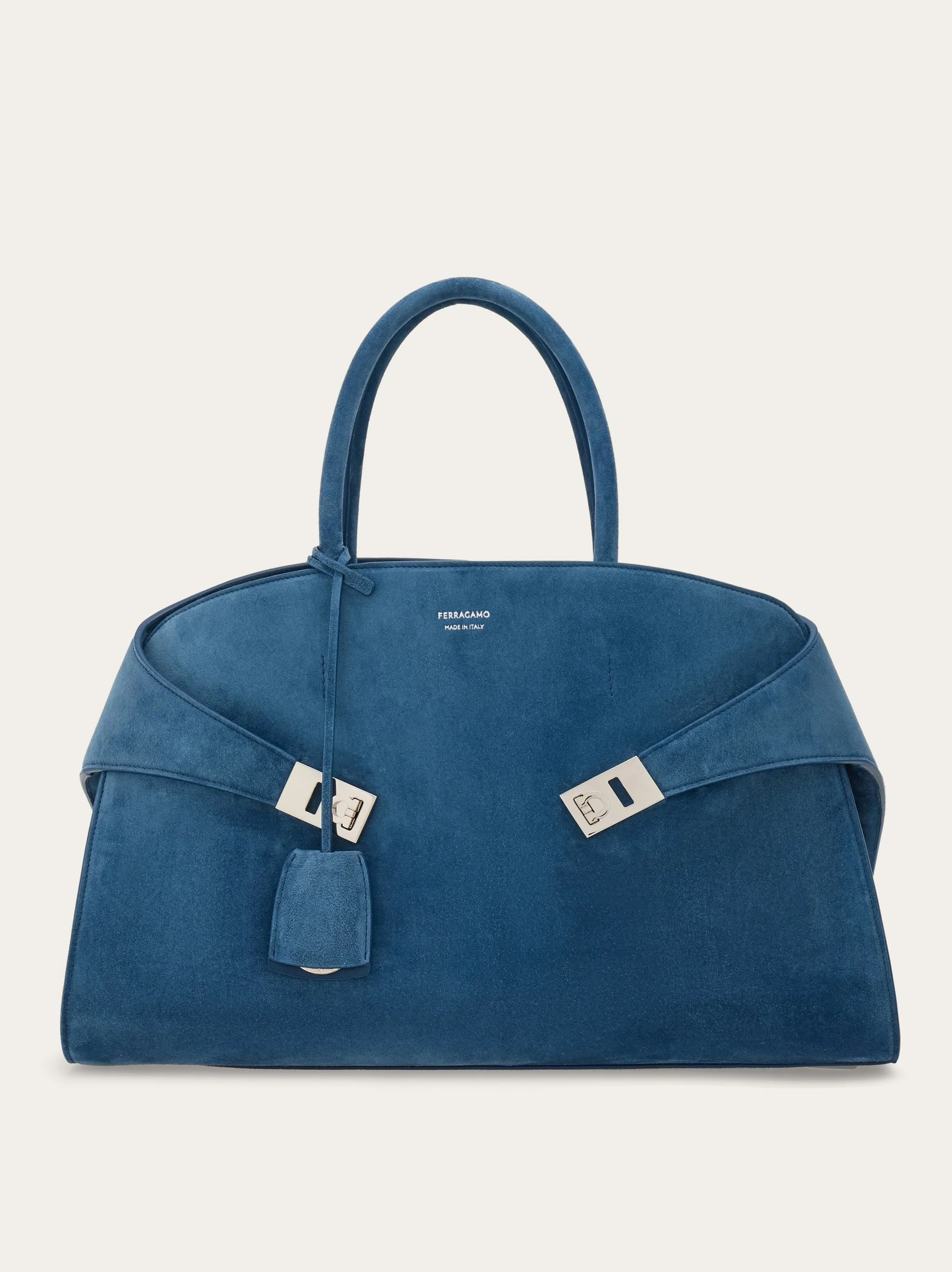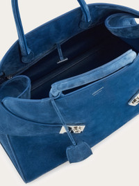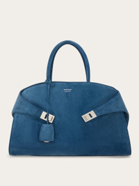 A retro-inspired take on the top handle bag, featuring a soft paneled construction in buttery soft suede. Spacious and perfectly organized, the special design features an asymmetrical back from which two wide straps wrap the side bellows and fasten on the front panel via palladium-toned Gancini buckles. The internal compartment has a ring closure, and is fitted with a lined zip pocket. A keychain charm dangles from the top handle, while custom metal studs protect the base. - A) Height 9.4 IN B) Length 14.9 IN C) Width 8.6 IN - Composition: suede - Handle drop: 5.5 in/14 cm - Large - Made in ITALY - Product code: 219915 779240
