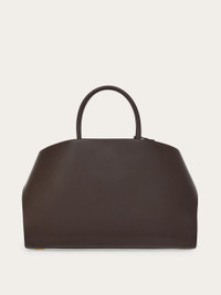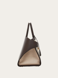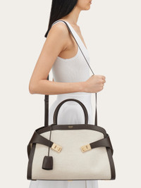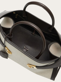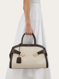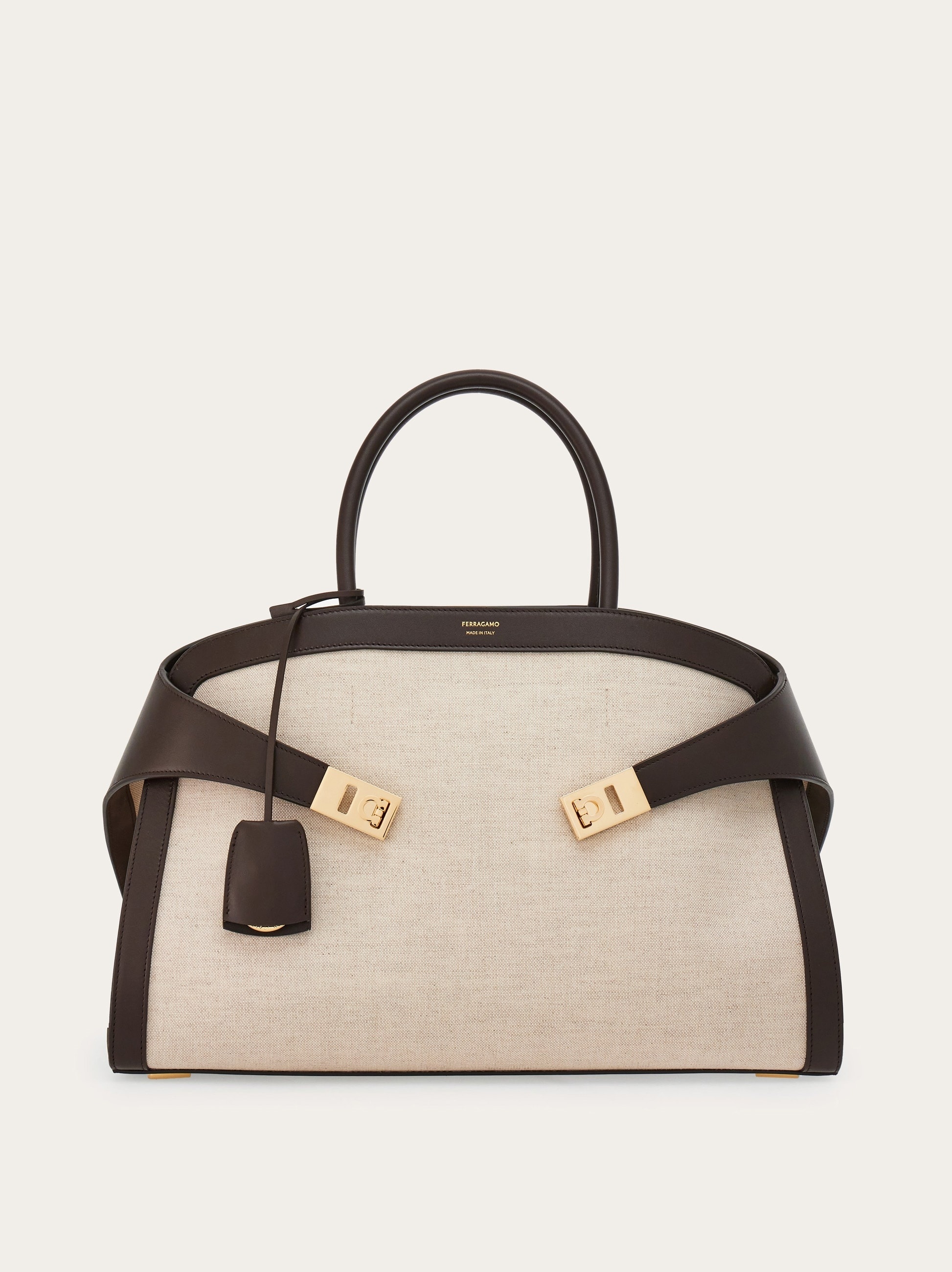 Contemporary silhouettes and timeless elegance. The Ferragamo Hug bag is revised here in a summer key. Calfskin leather side straps wrap around from the back to close the billows and fasten at the front via a custom metal clasp. The front panel, made of cotton linen canvas contrasts beautifully with the leather, and the zip fastening opens at the top to reveal a lined interior with zip pocket. A tonal leather fob is placed on the rigid top handle, and the lined interior features a zip pocket. Rectangular foot studs provide protection and confirm her iconic status. - height 9.4 IN length 14.9 IN width 8.6 IN - Composition: fabric and leather - Made in ITALY - Product code: 215992 768824