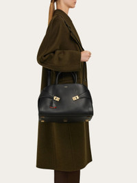 New retro-inspired top-handle bag featuring a soft structure and shiny calfskin panels. Large and spacious, it features a special construction with an asymmetrical back that surrounds the accordion details on the sides and fastens with the golden-finish Gancini buckles. It fastens on the inside with a ring and is complemented by the keyring charm and zipped lined pocket. The branded rectangular feet studs ensure protection for the base. - A) Height 9.4 IN B) Length 14.9 IN C) Width 8.6 IN - Composition: calfskin - Handle drop: 5.5 in/14 cm - Large - Made in ITALY - Product code: 215921 767651