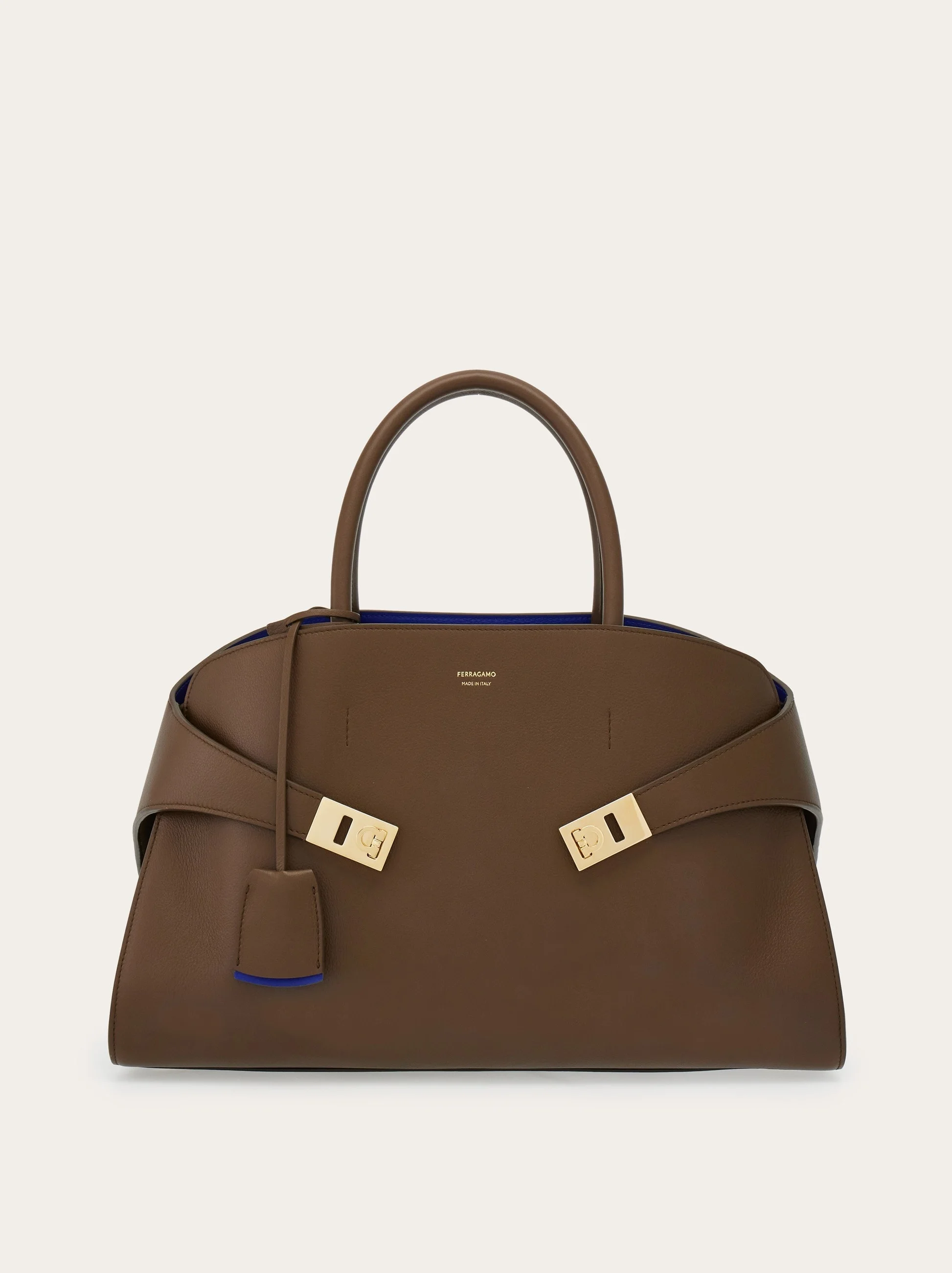 New retro-inspired top-handle bag featuring a soft structure and natural-grain calfskin panels. This compact version features a construction with asymmetrical back that wraps the accordion sides and fastens with the golden-finish Gancini buckles. It fastens on the inside with a ring and is complemented by the keyring charm and zipped lined pocket. The branded rectangular feet studs ensure protection for the base. - A) Height 9.4 IN B) Length 14.9 IN C) Width 8.6 IN - Composition: calfskin - Handle drop: 5.5 in/14 cm - Large - Made in ITALY - Product code: 215921 771868