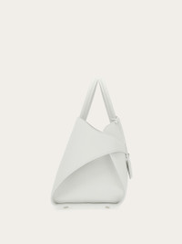 New retro-inspired top-handle bag featuring a soft structure and natural-grain calfskin panels. Large and spacious, it features a special construction with an asymmetrical back that surrounds the accordion details on the sides and fastens with the palladium Gancini buckles. It fastens on the inside with a ring and is complemented by the keyring charm and zipped lined pocket. The branded rectangular feet studs ensure protection for the base. - A) Height 9.4 IN B) Length 14.9 IN C) Width 8.6 IN - Composition: calfskin - Handle drop: 5.5 in/14 cm - Large - Made in ITALY - Product code: 215921 766650