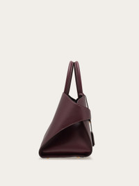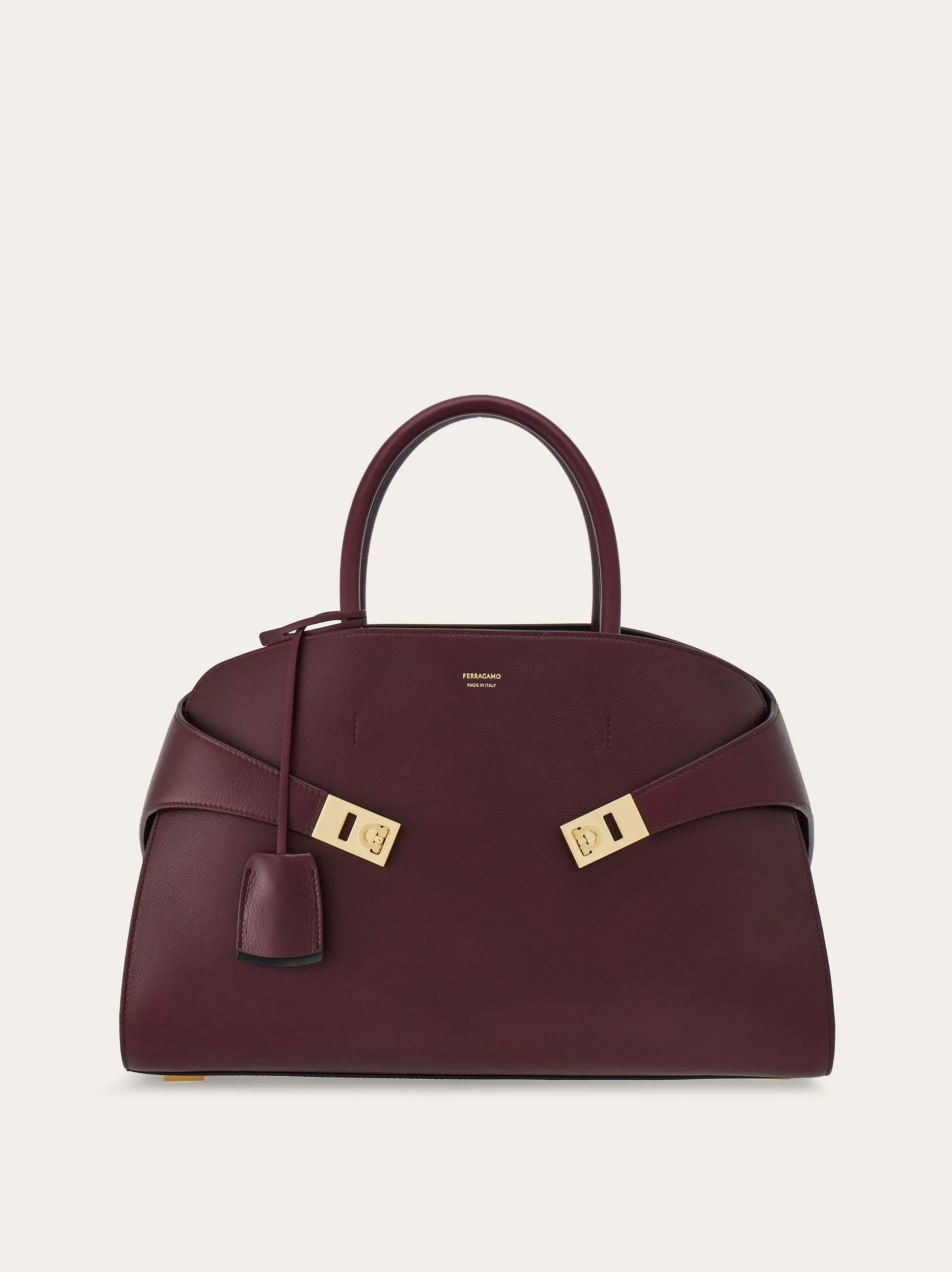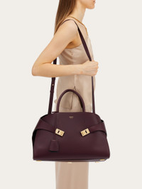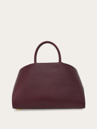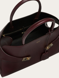 New retro-inspired top-handle bag featuring a soft structure and shiny calfskin panels. Large and spacious, it features a special construction with an asymmetrical back that surrounds the accordion details on the sides and fastens with the golden-finish Gancini buckles. It fastens on the inside with a ring and is complemented by the keyring charm and zipped lined pocket. The branded rectangular feet studs ensure protection for the base. - A) Height 9.4 IN B) Length 14.9 IN C) Width 8.6 IN - Composition: calfskin - Handle drop: 5.5 in/14 cm - Large - Made in ITALY - Product code: 215921 769113