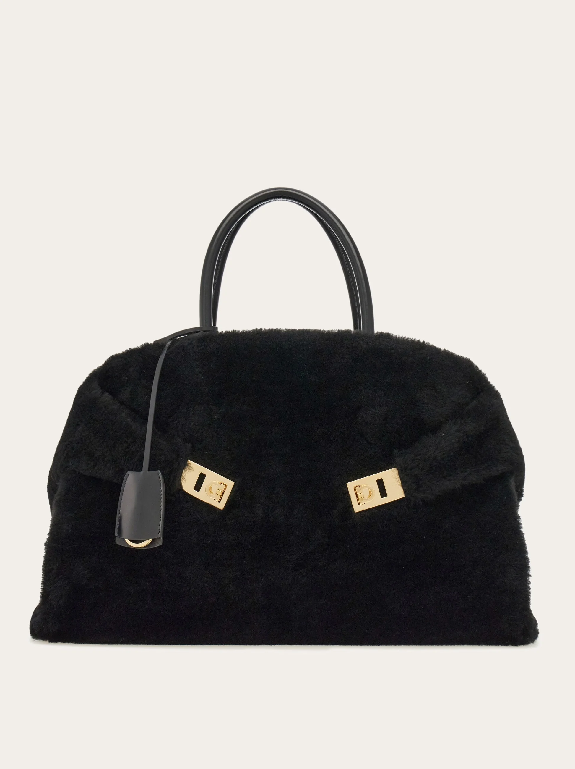 The signature silhouette of the Ferragamo Hug bag in soft, fluffy merino wool. The distinctive wrap-around construction with golden Gancini buckles lends a sophisticated allure to this cozy top handle lined with calfskin leather and leather top handles. It fastens with a ring on the inside, where a zip pocket helps keep personal effects in order. Custom rectangular studs protect the base, and braided cotton strap offers hands-free style. - A) Height 9.4 IN B) Length 14.9 IN C) Width 8.6 IN - Composition: merino wool and calfskin - Handle drop: 5.5 in/14 cm - Large - Made in ITALY - Product code: 219894 779377