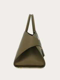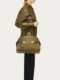 The Ferragamo Hug bag, a new contemporary icon, is reintroduced this season in hammered calfskin, vegetable dyed and tumbled for a rich, pebbled finish. The silhouette features an asymmetrical back panel that wraps around to ‘hug’ the front one via two wide leather straps with custom Gancini clasps. It fastens on the inside with a metallic ring, the lined interior features a zip pocket, and a tonal leather fob is placed on the rigid top handle. Rectangular foot studs protect the base and confirm her iconic status. - A) Height 9.4 IN B) Length 14.9 IN C) Width 8.6 IN - Composition: hammered calfskin - Handle drop: 5.5 in/14 cm - Large - Made in ITALY - Product code: 215921 777257