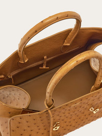 The dappled texture of ostrich leather gives this compact edition of the Ferragamo Hug an exclusive feel. An asymmetrical back panel wraps around to ‘hug’ the front via two wide leather straps with custom Gancio clasps. It fastens on the inside with a metallic ring, while the lined interior features a zip pocket, and a tonal leather fob is placed on the rigid top handle. Rectangular foot studs provide protection and confirm her iconic status. Removable leather shoulder strap. - A) Height 8.6 IN B) Length 12.4 IN C) Width 7.4 IN - Composition: ostrich - Handle drop: 5.5 in/14 cm - Medium - Made in ITALY - Product code: 219199 781727