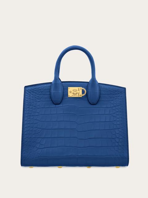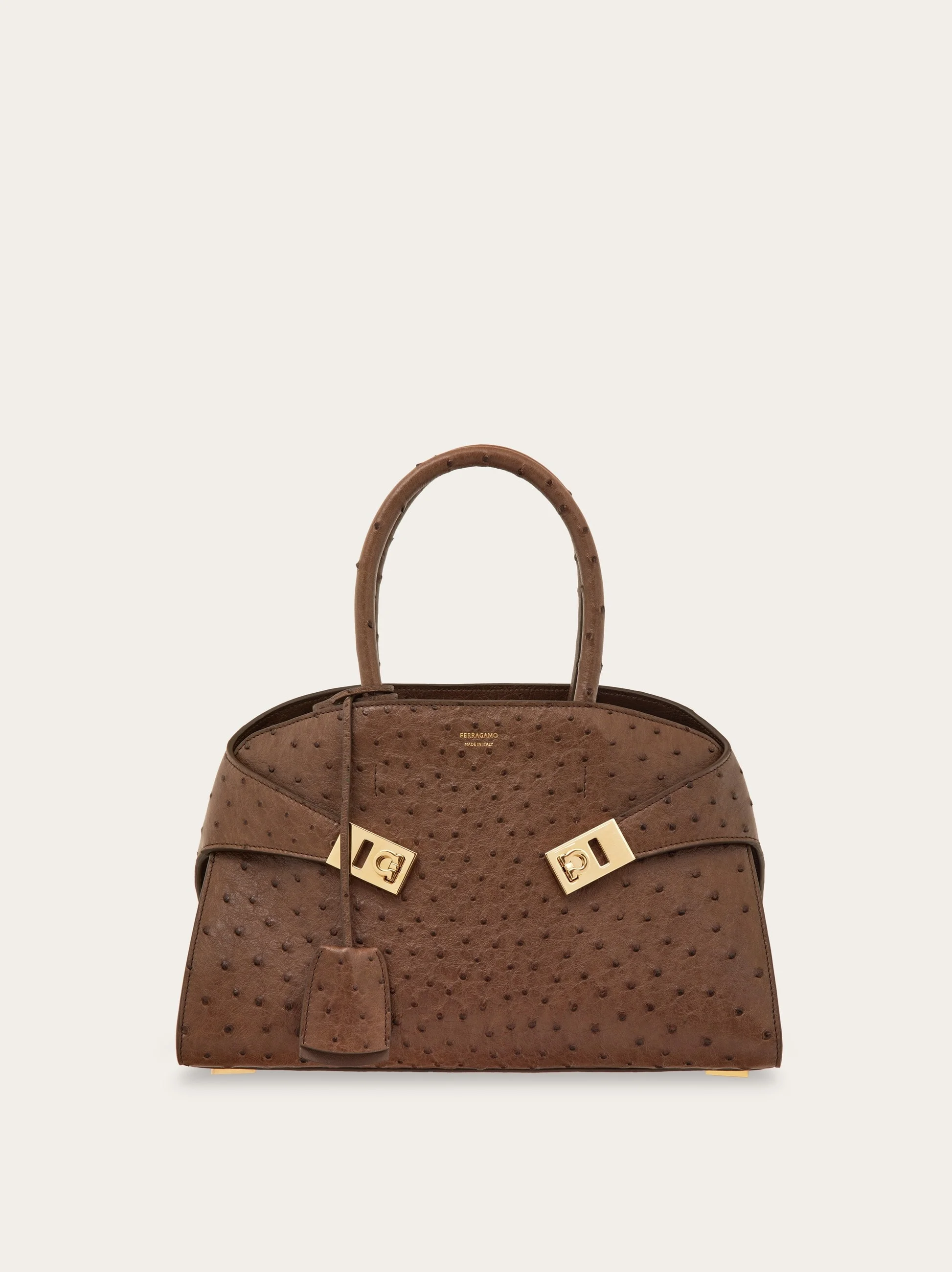 The dappled texture of ostrich leather gives this compact edition of the Ferragamo Hug an exclusive feel. An asymmetrical back panel wraps around to ‘hug’ the front via two wide leather straps with custom Gancio clasps. It fastens on the inside with a metallic ring, while the lined interior features a zip pocket, and a tonal leather fob is placed on the rigid top handle. Rectangular foot studs provide protection and confirm her iconic status. Removable leather shoulder strap. - A) Height 8.6 IN B) Length 12.4 IN C) Width 7.4 IN - Composition: ostrich - Handle drop: 5.5 in/14 cm - Medium - Made in ITALY - Product code: 219199 781728