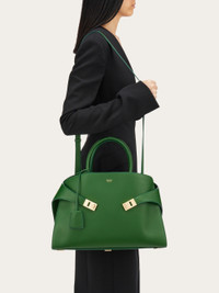 The Ferragamo Hug bag, a new retro-inspired top handle with a sophisticated allure. Made of calfskin with a natural grainy finish, it has an asymmetrical back panel that wraps around to ‘hug’ the front one via two wide leather straps with custom Gancio clasps. It fastens on the inside with a metallic ring, the lined interior features a zip pocket, and a tonal leather fob is placed on the rigid top handle. Rectangular foot studs provide protection and confirm her iconic status. - A) Height 9.4 IN B) Length 14.9 IN C) Width 8.6 IN - Composition: calfskin - Handle drop: 5.5 in/14 cm - Large - Made in ITALY - Product code: 215921 772847