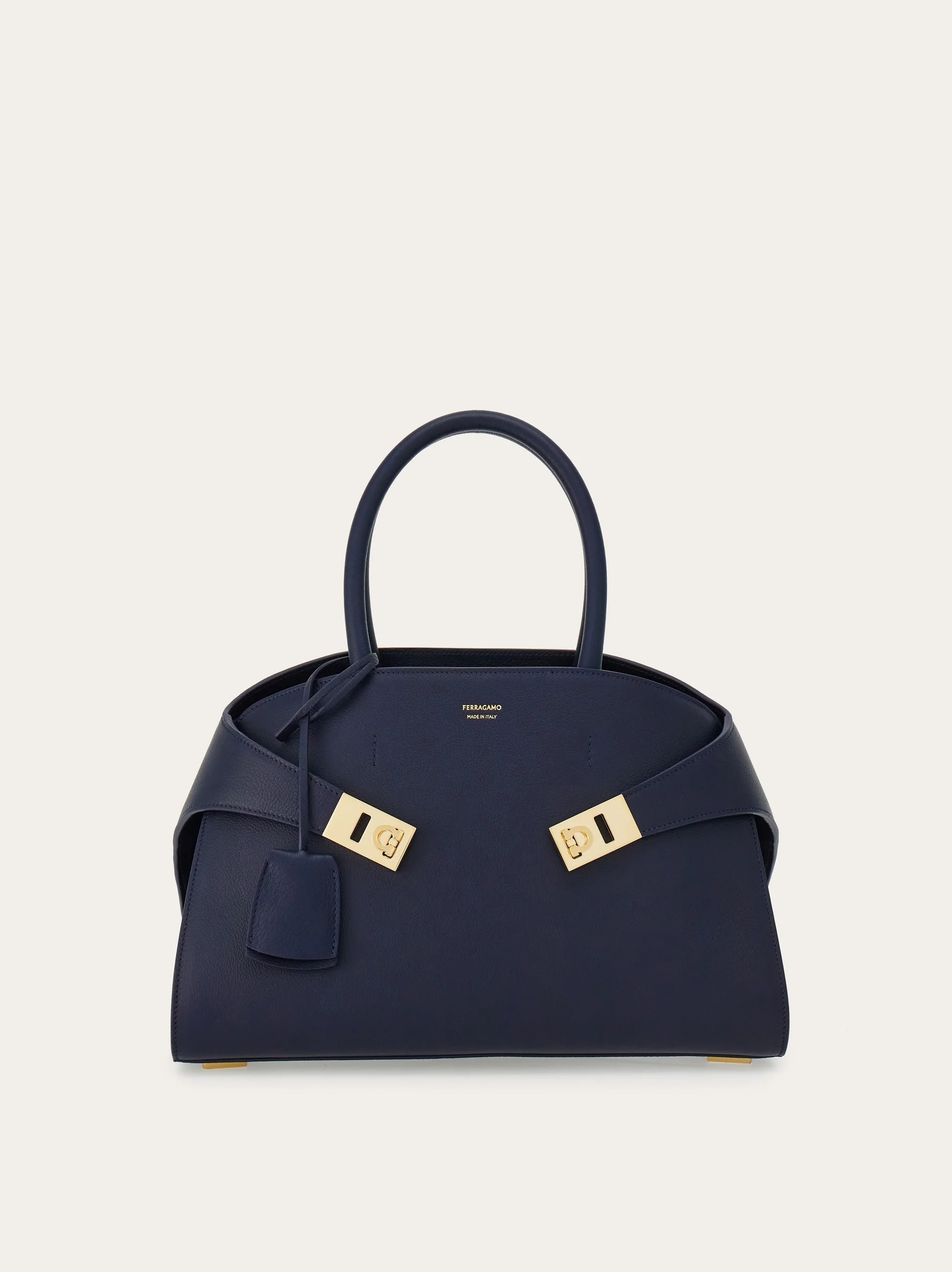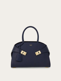 New retro-inspired top-handle bag featuring a soft structure and natural-grain calfskin panels. This compact version features a construction with asymmetrical back that wraps the accordion sides and fastens with the golden-finish Gancini buckles. It fastens on the inside with a ring and is complemented by the keyring charm and zipped lined pocket. The branded rectangular feet studs ensure protection for the base. - A) Height 8.6 IN B) Length 12.4 IN C) Width 7.4 IN - Composition: calfskin - Handle drop: 5.5 in/14 cm - Medium - Made in ITALY - Product code: 215608 766762