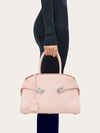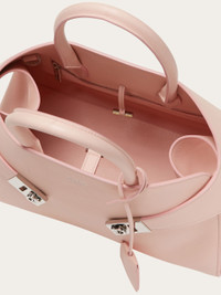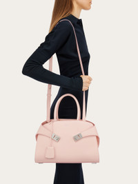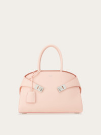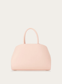 New retro-inspired top-handle bag featuring a soft structure and natural-grain calfskin panels. This compact version features a construction with asymmetrical back that wraps the accordion sides and fastens with the golden-finish Gancini buckles. It fastens on the inside with a ring and is complemented by the keyring charm and zipped lined pocket. The branded rectangular feet studs ensure protection for the base. - height 22.0 CM / 8.6 IN length 31.5 CM / 12.4 IN width 19.0 CM / 7.4 IN - Composition: calfskin - Product code: 215608 769116 - Made in ITALY