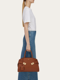 Braided leather accents add an artisanal twist to the new, compact version of the Hug silhouette. Made of the softest calfskin, braided leather wraps the top handle and trim of the keyring fob for an exclusive finish. The silhouette is textbook, with two wide straps that reach around from the asymmetrical back panel to wrap the side bellows and fasten on the front via golden Gancio buckles. Custom studs protect the base. Removable leather shoulder strap for hands free style. - A) Height 8.6 IN B) Length 12.4 IN C) Width 7.4 IN - Composition: calfskin - Handle drop: 5.5 in/14 cm - Medium - Made in ITALY - Product code: 219451 774744