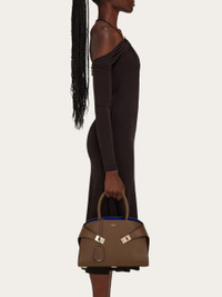 New retro-inspired top-handle bag featuring a soft structure and natural-grain calfskin panels. This compact version features a construction with asymmetrical back that wraps the accordion sides and fastens with the golden-finish Gancini buckles. It fastens on the inside with a ring and is complemented by the keyring charm and zipped lined pocket. The branded rectangular feet studs ensure protection for the base. - A) Height 8.6 IN B) Length 12.4 IN C) Width 7.4 IN - Composition: calfskin - Handle drop: 5.5 in/14 cm - Medium - Made in ITALY - Product code: 215608 771867