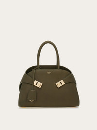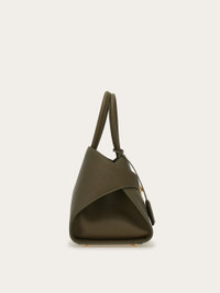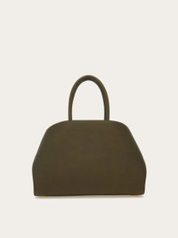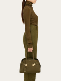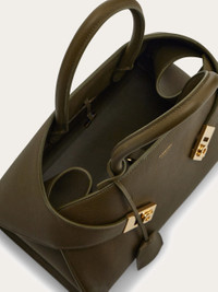 The Ferragamo Hug bag, a new contemporary icon, is reintroduced this season in hammered calfskin, vegetable dyed and tumbled for a rich, pebbled finish. The silhouette features an asymmetrical back panel that wraps around to ‘hug’ the front one via two wide leather straps with custom Gancini clasps. It fastens on the inside with a metallic ring, the lined interior features a zip pocket, and a tonal leather fob is placed on the rigid top handle. Rectangular foot studs protect the base and confirm her iconic status. - A) Height 8.6 IN B) Length 12.4 IN C) Width 7.4 IN - Composition: hammered calfskin - Handle drop: 5.5 in/14 cm - Medium - Made in ITALY - Product code: 215608 777523