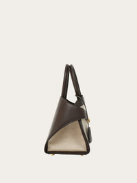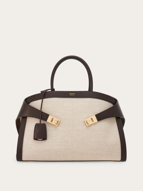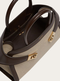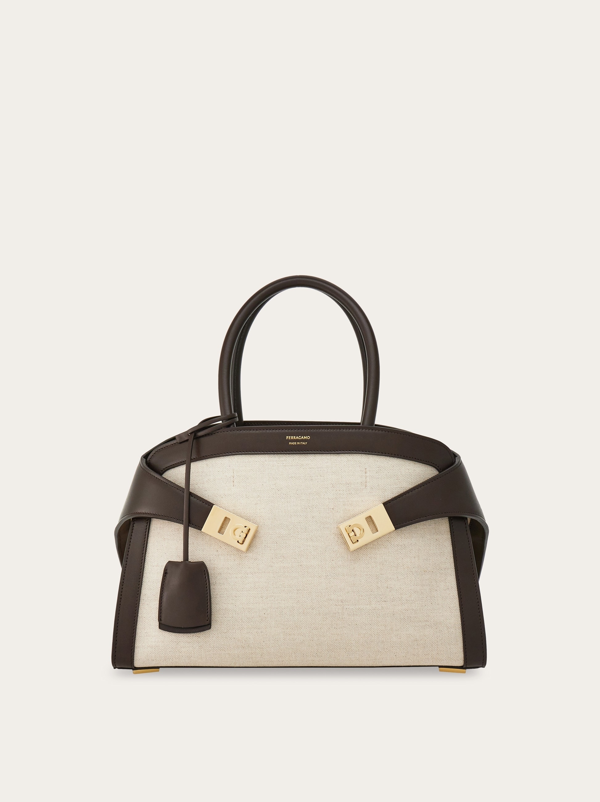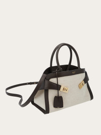 Contemporary silhouettes and timeless elegance. The Ferragamo Hug bag is revised here in a summer key with compact dimensions. Calfskin leather side straps wrap around from the back to close the billows and fasten at the front via a custom metal clasp. The front panel, made of cotton linen canvas contrasts beautifully with the leather, and the zip fastening opens at the top to reveal a lined interior with zip pocket. Rectangular foot studs provide protection and confirm her iconic status. - height 8.6 IN length 12.4 IN width 7.4 IN - Composition: fabric and leather - Made in ITALY - Product code: 216377 768825