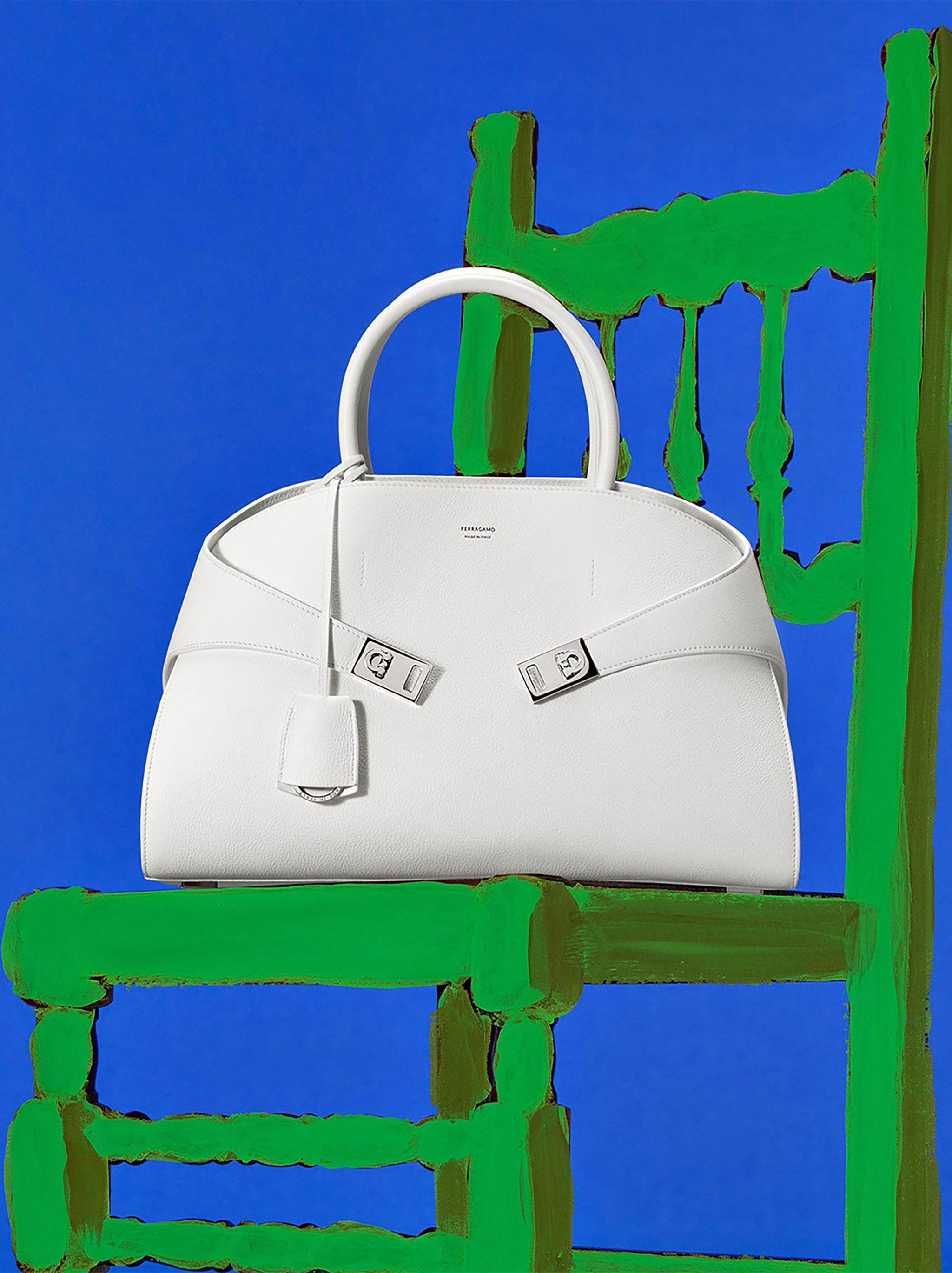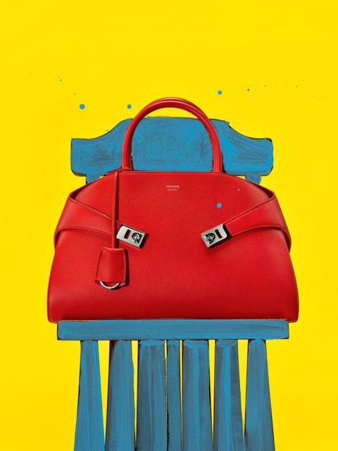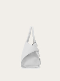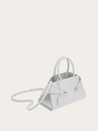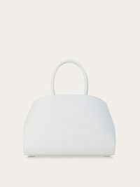 New retro-inspired top-handle bag featuring a soft structure and natural-grain calfskin panels. This compact version features a construction with asymmetrical back that wraps the accordion sides and fastens with the palladium-finish Gancini buckles. It fastens on the inside with a ring and is complemented by the keyring charm and zipped lined pocket. The branded rectangular feet studs ensure protection for the base. - height 22.0 CM / 8.6 IN length 31.5 CM / 12.4 IN width 19.0 CM / 7.4 IN - Composition: calfskin - Product code: 215608 766759 - Made in ITALY