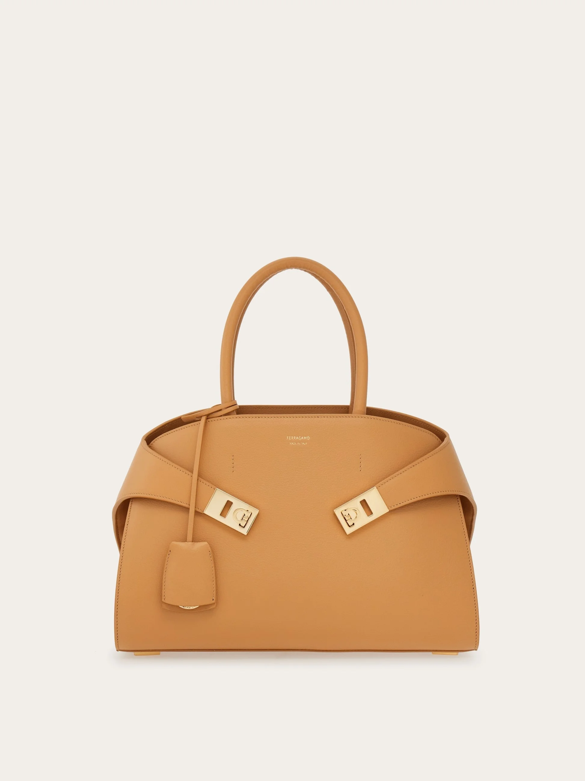 New retro-inspired top-handle bag featuring a soft structure and natural-grain calfskin panels. This compact version features a construction with asymmetrical back that wraps the accordion sides and fastens with the golden-finish Gancini buckles. It fastens on the inside with a ring and is complemented by the keyring charm and zipped lined pocket. The branded rectangular feet studs ensure protection for the base. - A) Height 8.6 IN B) Length 12.4 IN C) Width 7.4 IN - Composition: calfskin - Handle drop: 5.5 in/14 cm - Medium - Made in ITALY - Product code: 215608 769115