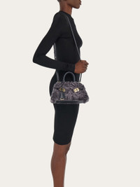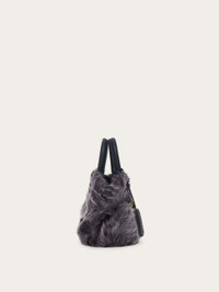 Simply gorgeous. This ultra-soft edition of the Ferragamo Hug bag is one to have to hold, and certainly to admire. The soft, fluffy shearling dials and rounded edges bring a softness to the rigid structure, echoed by the two straps that emanate from the back quadrant and wrap the billows, fastening at the front via two golden Hug buckles. The look is ladylike contemporary, with a keychain charm that dangles playfully from the top handle, and a detachable shoulder strap for handsfree styling. - A) Height 5.5 IN B) Length 8.8 IN C) Width 4.3 IN - Composition: kid shearling and calfskin leather - Handle drop: 3 in/7,5 cm - Extra small - Made in ITALY - Product code: 21A451 787979