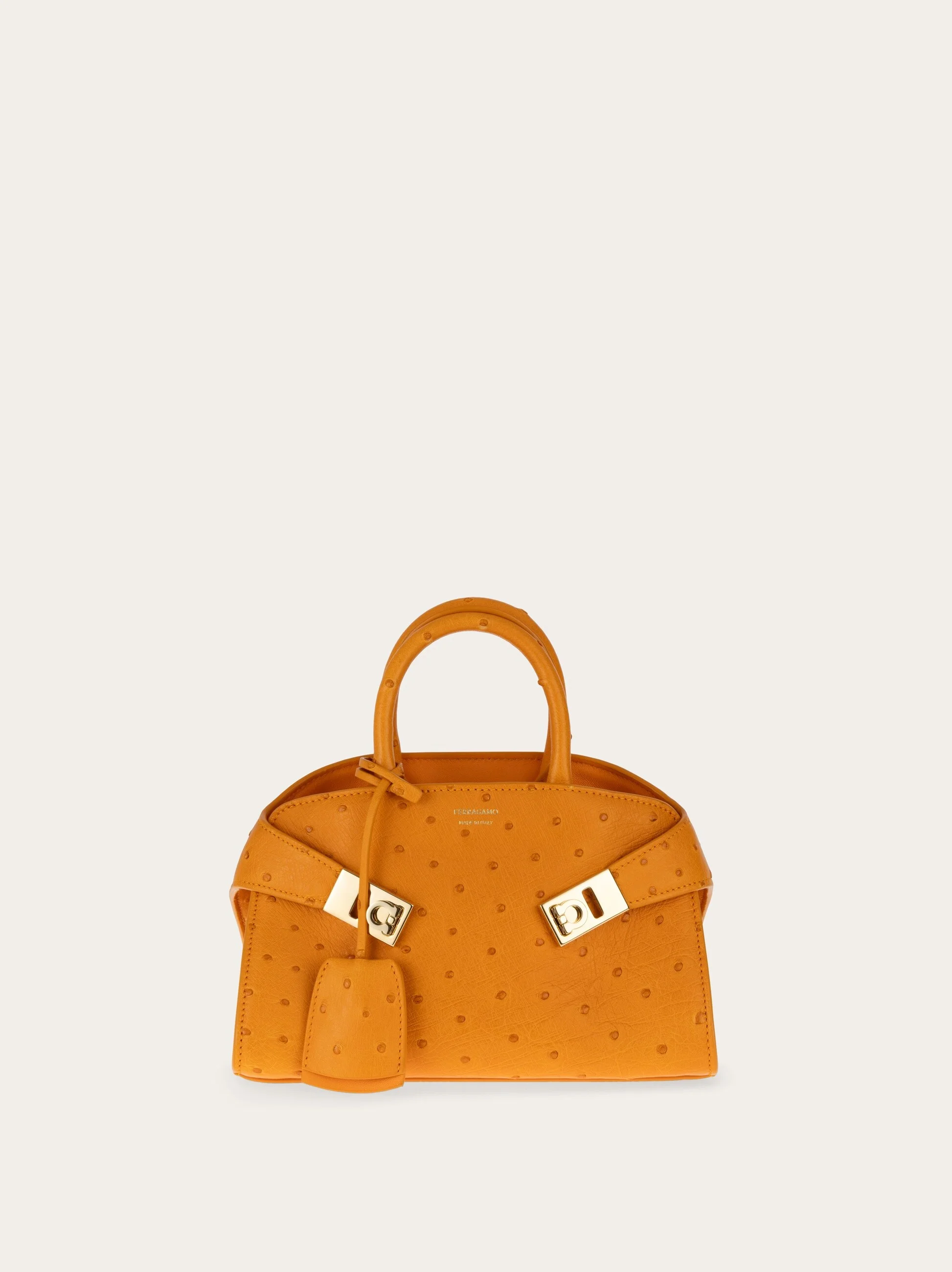 This ultra-glam take on the Ferragamo Hug bag is cut from precious ostrich leather. Compact yet capacious, the side straps can be secured via the Gancini buckles or left open for extra room. Signature features include a covered keyring which dangles playfully from the top handle, and custom studs on the base. Adjustable, removable shoulder strap. - A) Height 5.5 IN B) Length 8.8 IN C) Width 4.3 IN - Composition: ostrich leather - Handle drop: 2.9 in/7,5 cm - Extra Small - Made in ITALY - Product code: 219610 787051