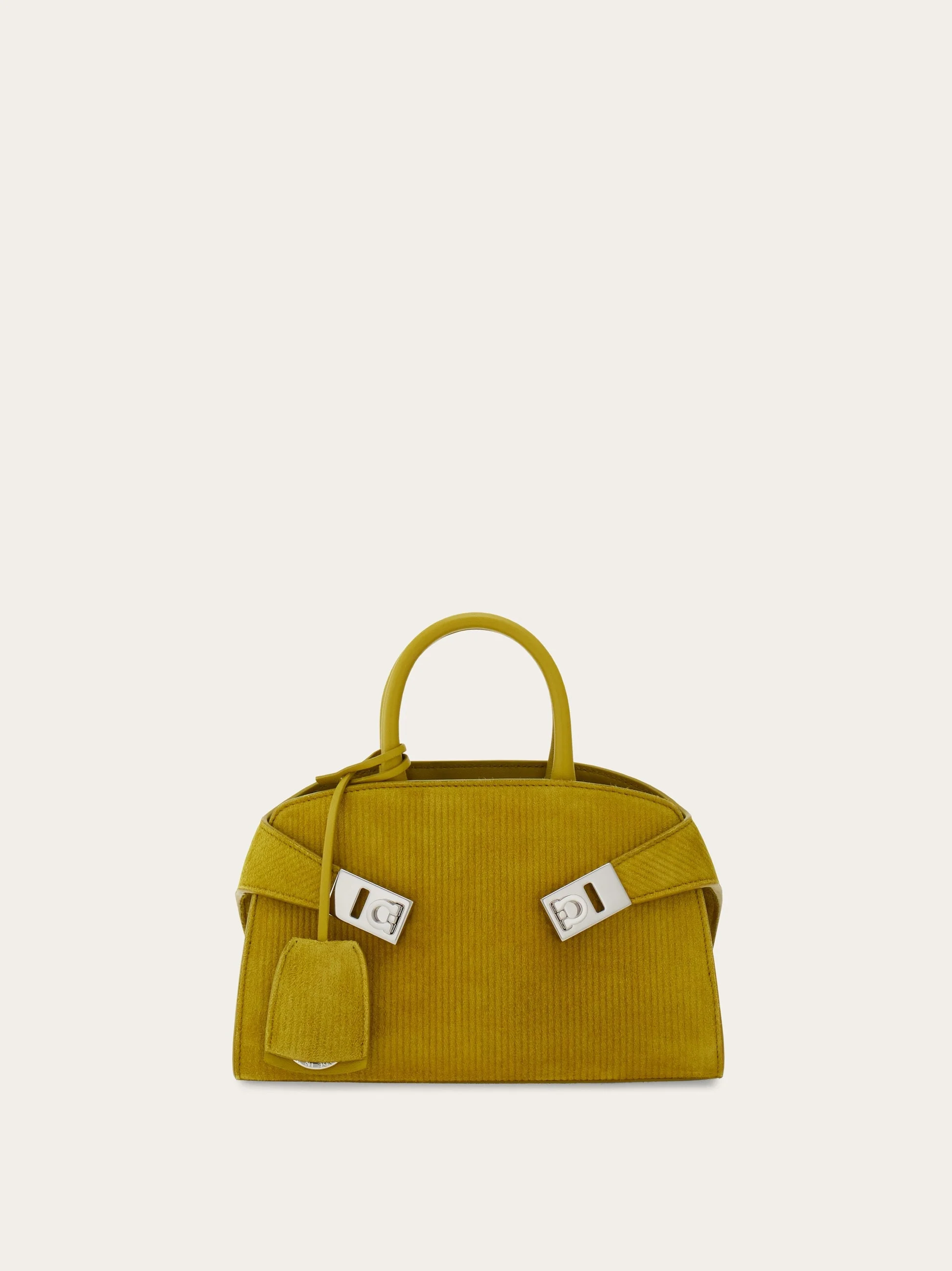 A compact take on the Ferragamo Hug bag, in luxurious calfskin suede. The smooth cloth takes on the texture of corduroy with a sumptuous ripple all over. Two wide straps reach around from the asymmetrical back, wrap the side bellows and fasten at the front via golden Gancio buckles. This contemporary icon has two slot pockets inside, and a covered keyring which dangles playfully from the top handle. A removable tonal strap offers a hands free styling option. - A) Height 5.5 IN B) Length 8.8 IN C) Width 4.3 IN - Composition: calfskin suede - Handle drop: 2.9 in/7,5 cm - Extra Small - Made in ITALY - Product code: 215975 785782