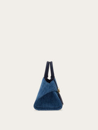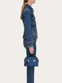 A compact edition of a contemporary icon: the Ferragamo Hug bag. With denim panels and tonal leather accents, this compact accessory will add a cool touch to any outfit. The unmistakable shape features side straps that fasten at the front via golden Gancini buckles, a covered keyring that hangs playfully from the top handle. A removable shoulder strap offers hands free styling. - A) Height 5.5 IN B) Length 8.8 IN C) Width 4.3 IN - Composition: denim - Handle drop: 2.9 in/7,5 cm - Extra Small - Made in ITALY - Product code: 219902 783820