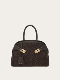 Cool and current with an iconic appeal, the new iteration of the Ferragamo Hug featuring the timeless Gancini. Soft semi-gloss calfskin 3D trims frame the jacquard dials, woven in a hypnotic pattern of Gancini silhouettes, and two golden Gancini buckles fasten at the front. Rectangular foot studs protect the base, and a removable shoulder strap offers hands free styling. - A) Height 8.6 IN B) Length 12.4 IN C) Width 7.4 IN - Composition: fabric and calfskin - Handle drop: 5.5 in/14 cm - Medium - Made in ITALY - Product code: 219847 777527