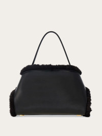 Compact and luxurious, the new version of the Ferragamo Hug bag is cut from soft calfskin featuring mink-effect kid skin trims. The fluffy fabric bursts out from the iconic silhouette with Hug straps punctuated by golden hardware. A golden logo is embossed on the front. - A) Height 10.2 IN B) Length 14.7 IN C) Width 6.6 IN - Composition: kid leather and calfskin - Handle drop: 5.9 in/15 cm - Medium - Made in ITALY - Product code: 21A443 787875