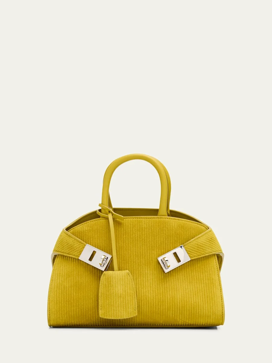 Ferragamo "Hug" top handle bag in suede corduroy and leather Rolled top handles with keyring tag Detachable, adjustable crossbody strap Can be worn as a top handle or crossbody bag Open top with side Gancini buckles Interior, two card slots Lining: Leather Approx. 5.5"H x 8.9"W x 4.3"D Made in Italy Online Inquiries: BGS21_V6GT9| Store Inquiries: #4986180