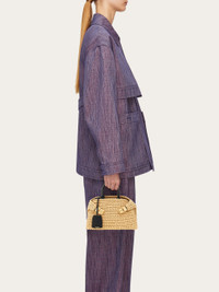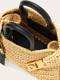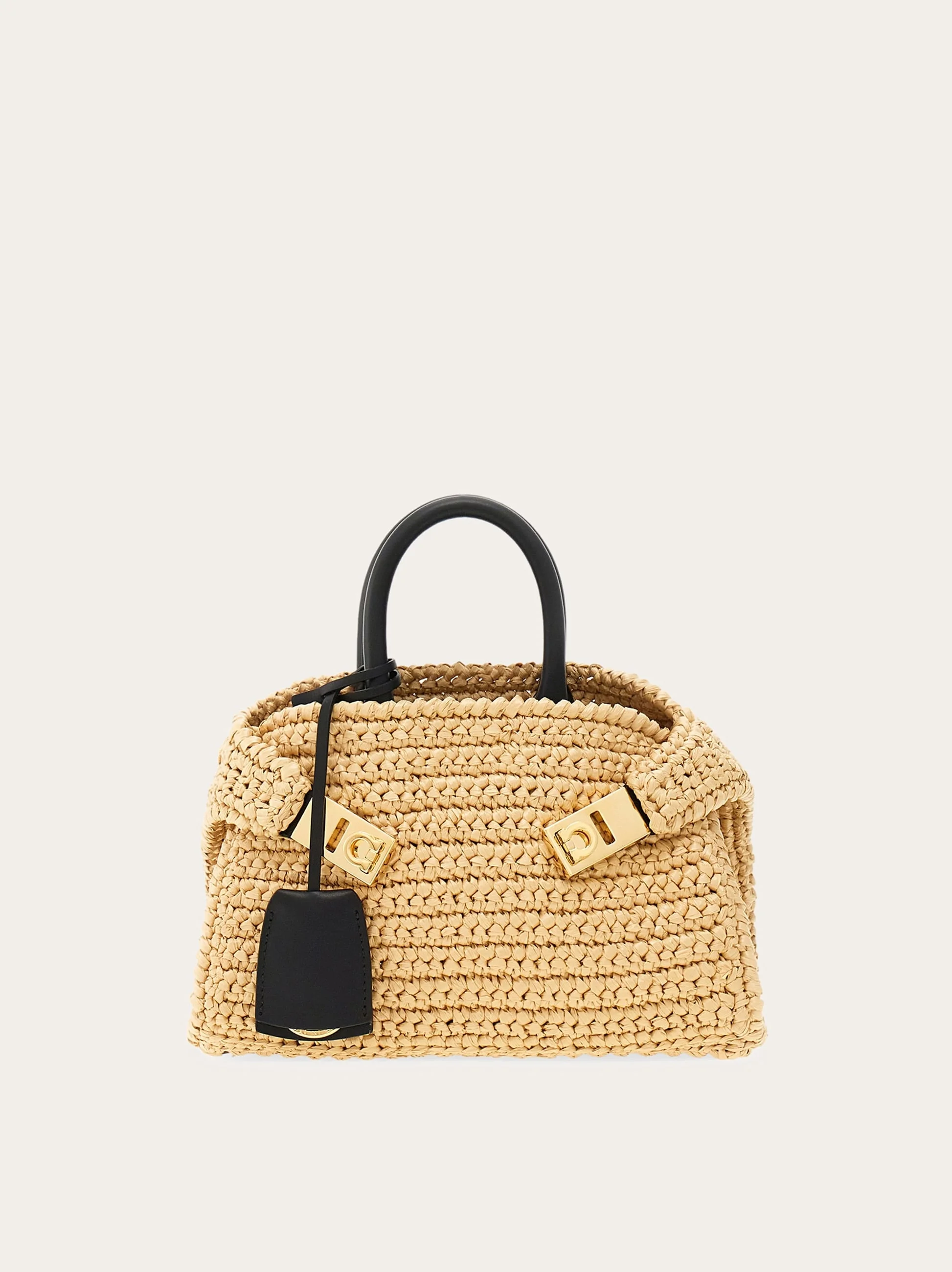The unique Hug silhouette is brought to life in hand-woven raffia-effect fabric in seasonal hues. Compact and cool, it has wide straps that wrap the sides and fasten at the front via two golden Gancio buckles, and leather top handles with leather fob. The unlined interior is reinforced by a leather panel at the base, and has a leather slot on the back panel. Removable shoulder strap. - A) Height 6.1 IN B) Length 9.4 IN C) Width 4.3 IN - Composition: calfskin and raffia-effect fabric - Handle drop: 2.9 in/7,5 cm - Extra Small - Made in ITALY - Product code: 219397 773833