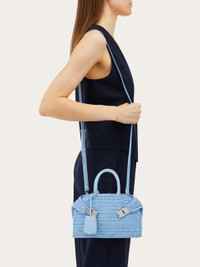 The unique Hug silhouette is brought to life in hand-woven raffia-effect fabric in seasonal hues. Compact and cool, it has wide straps that wrap the sides and fasten at the front via two golden Gancio buckles, and leather top handles with leather fob. The unlined interior is reinforced by a leather panel at the base, and has a leather slot on the back panel. Removable shoulder strap. - A) Height 6.1 IN B) Length 9.4 IN C) Width 4.3 IN - Composition: calfskin and raffia-effect fabric - Handle drop: 2.9 in/7,5 cm - Extra Small - Made in ITALY - Product code: 219397 774169