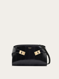 Compact Iteration of the Ferragamo Hug bag, meticulously crafted from sophisticated elaphe leather with an intricate scale pattern and smooth finish. The design is both functional and stylish, with wide straps that wrap the bellows and fasten on the front panel via Gancini buckles. A key fob hangs from the top handle, and the removable cross-body strap provides a hands-free styling option. Custom metal studs protect the base. - A) Height 5.5 IN B) Length 9.4 IN C) Width 2.1 IN - Composition: elaphe - Mini - Made in ITALY - Product code: 219971 781806