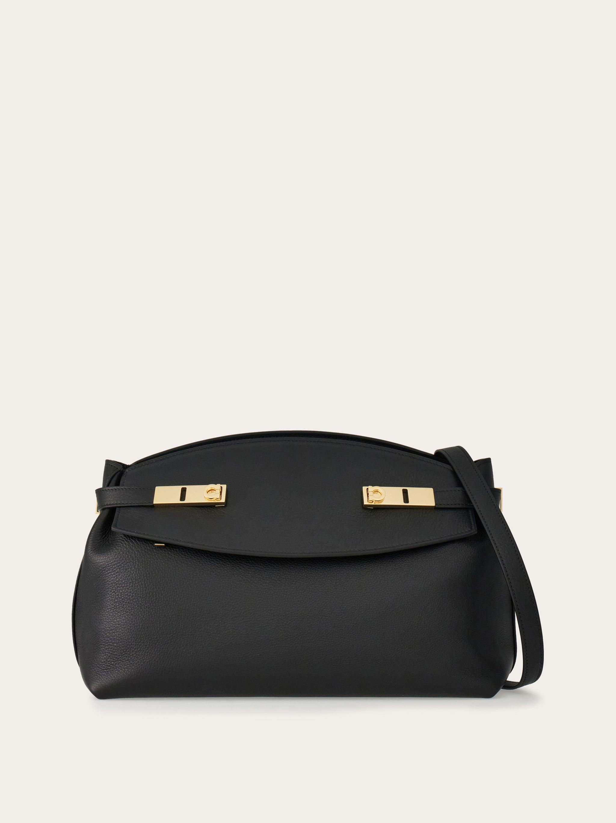 Soft and enveloping with metropolitan lines: the new Ferragamo pouch is the evolution of the crossbody bag from the new Hug line, crafted from soft natural-grain calfskin. The deconstructed construction with side straps creates delicate gathering, for a “hug” effect. The Gancini buckles fasten on the front flap, covering the functional zipped pocket. The spacious lined interior is perfect for holding your personal items. Carry it as a handbag or crossbody bag with the adjustable leather strap. - height 23.0 CM / 9 IN length 32.0 CM / 12.5 IN width 18.0 CM / 7 IN - Composition: calfskin - Product code: 215890 766676 - Made in ITALY