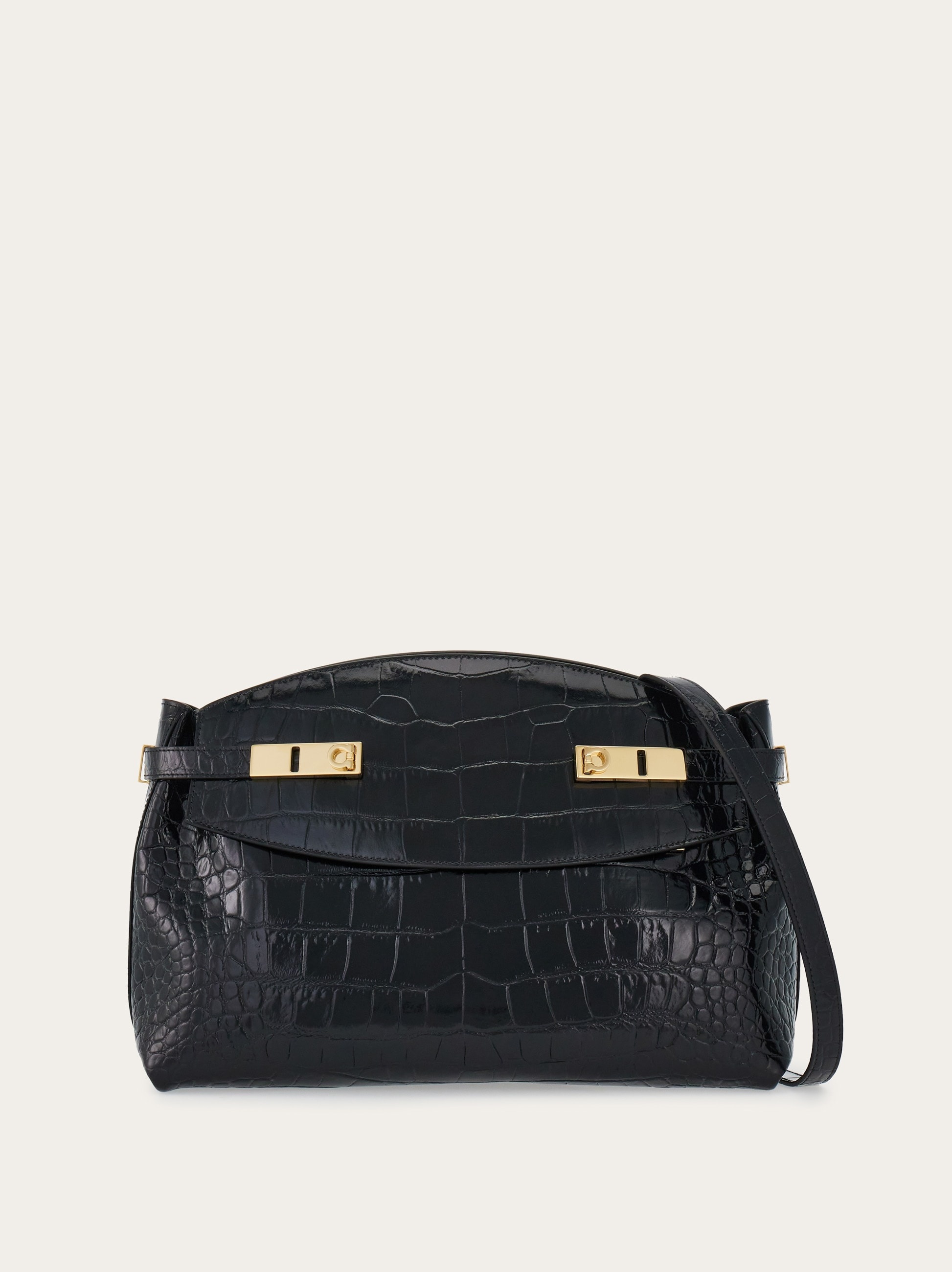 Soft and enveloping with metropolitan lines: the new Ferragamo pouch is the evolution of the crossbody bag from the new Hug line, crafted from soft natural-grain calfskin. The deconstructed construction with side straps creates delicate gathering, for a “hug” effect. The Gancini buckles fasten on the front flap, covering the functional zipped pocket. The spacious lined interior is perfect for holding your personal items. Carry it as a handbag or crossbody bag with the adjustable leather strap. - height 9.0 IN length 12.5 IN width 7.0 IN - Composition: printed calfskin - Made in ITALY - Product code: 215890 766694