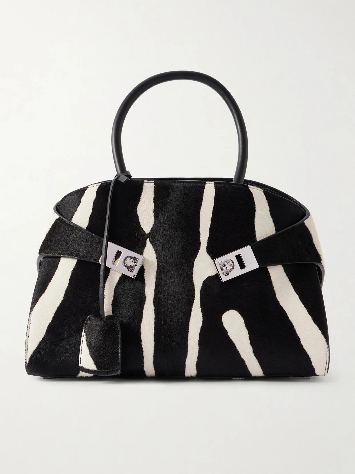 Ferragamo's 'Hug' tote brings a bold note to everyday dressing while retaining the house's signature elegance. Made from zebra-print calf hair, it has a structured leather handle and a compact interior that keeps daily essentials neatly organised. Let it stand out against monochrome tailoring or denim.