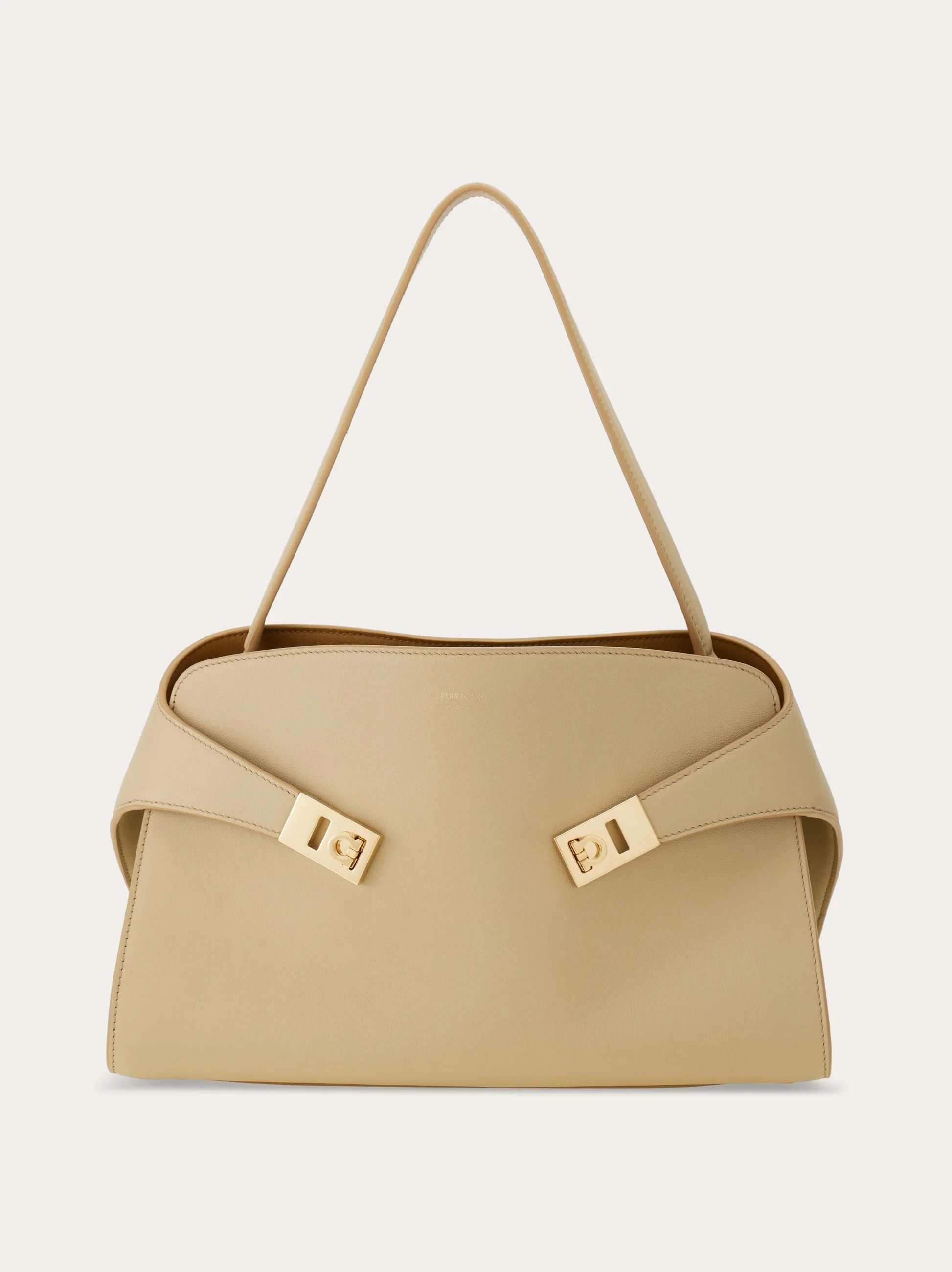 The Hug Soft shoulder bag features the distinctive enveloping shape of the Hug in a deconstructed version. Made of calfskin it features a single handle for a softer silhouette on the front panel, which is decorated with golden Gancini buckles. Closed with an internal flap equipped with magnets and a practical T-bar, this version features a contrasting lining for a refined color block effect. The central zipped compartment divides the interior into perfectly organized sections. Adjustable and detachable strap for multiple styling options. - A) Height 10.0 IN B) Length 13.3 IN C) Width 6.1 IN - Composition: calfskin - Handle drop: 7.2 in/18,5 cm - Medium - Made in ITALY - Product code: 219816 780594