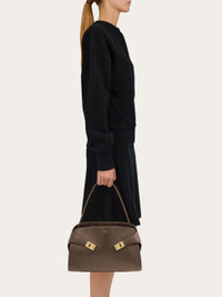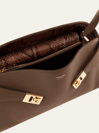 A harmonious blend of clean lines and distinctive accents define this take on the iconic Hug. The Soft Hug bag by Ferragamo, an intriguing silhouette cut from smooth calfskin with python leather inserts that elevate its sense of luxury. Golden hardware confirms its high end status. Removable shoulder strap. - A) Height 10.0 IN B) Length 13.3 IN C) Width 6.1 IN - Composition: calfskin and python - Medium - Made in ITALY - Product code: 21A214 784063