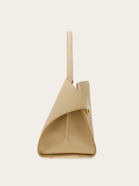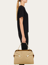 The Hug bag is reimagined in a deconstructed style, giving life to the new Hug Soft shoulder bag. Characterized by its unmistakable wrap-around design, this variant features a single handle that adds greater softness to the front quadrant, illuminated by the Gancini buckles in gold finish. Closed with an internal flap equipped with magnets and a practical T-bar, this medium-sized version features a contrasting interior for a refined color block effect. The central compartment with a zip ensures perfect functionality. - A) Height 12.0 IN B) Length 15.7 IN C) Width 5.9 IN - Composition: calfskin - Large - Made in ITALY - Product code: 219939 780517