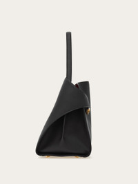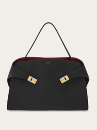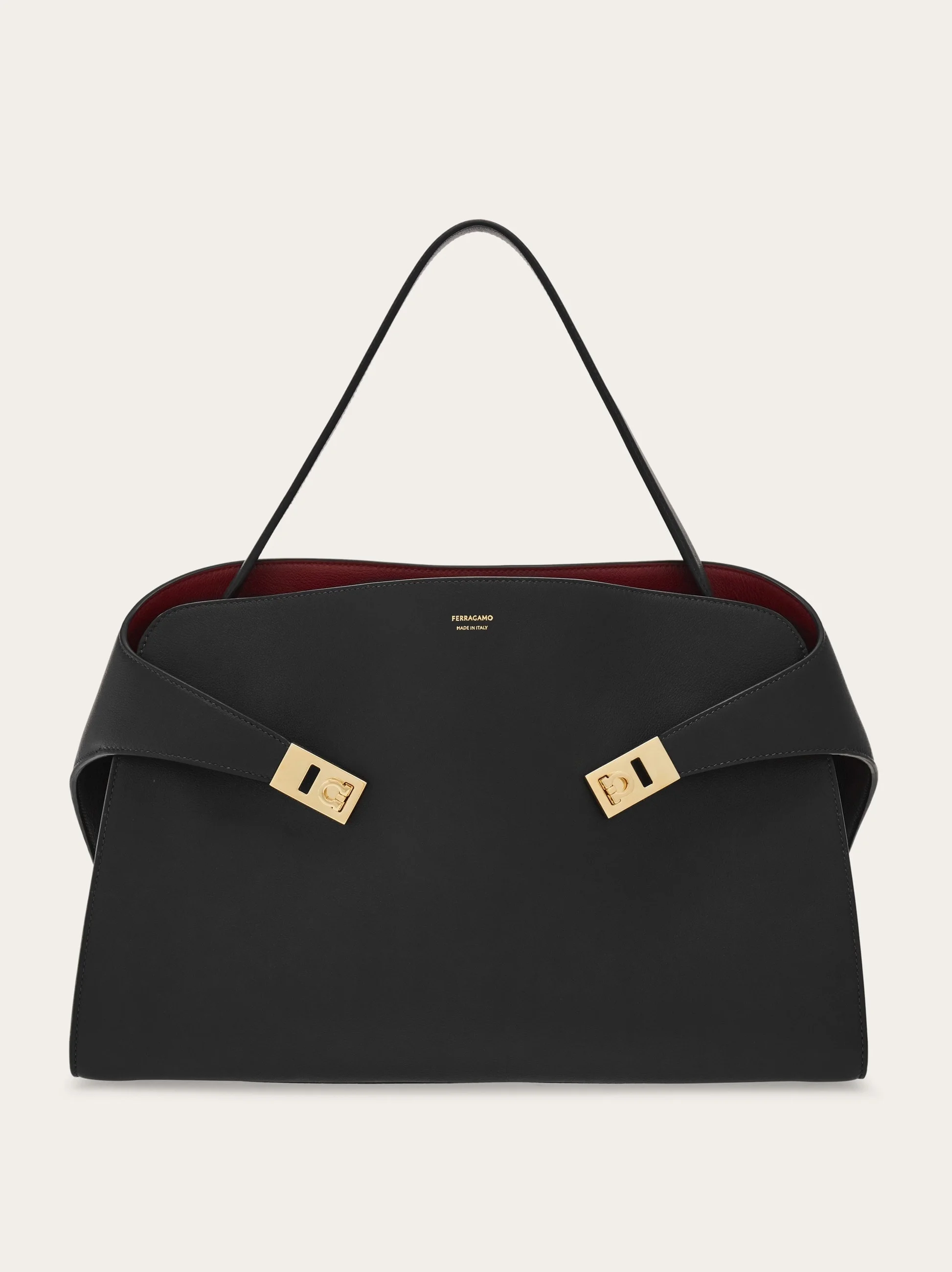 The Hug bag is reimagined in a deconstructed style, giving life to the new Hug Soft shoulder bag. Characterized by its unmistakable wrap-around design, this variant features a single handle that adds greater softness to the front quadrant, illuminated by the Gancini buckles in gold finish. Closed with an internal flap equipped with magnets and a practical T-bar, this medium-sized version features a contrasting interior for a refined color block effect. The central compartment with a zip ensures perfect functionality. - A) Height 12.0 IN B) Length 15.7 IN C) Width 5.9 IN - Composition: calfskin - Large - Made in ITALY - Product code: 219939 781693