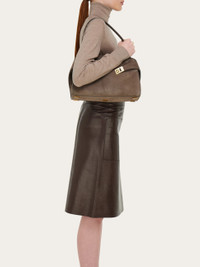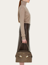 A harmonious blend of clean lines and distinctive accents define this take on the iconic Hug. The Soft Hug bag by Ferragamo, an intriguing silhouette cut from smooth calfskin with striking two tone details. Golden hardware confirms its high end status. Removable shoulder strap. - A) Height 10.0 IN B) Length 13.3 IN C) Width 6.1 IN - Composition: calfskin suede - Handle drop: 7.2 in/18,5 cm - Medium - Made in ITALY - Product code: 219816 784180
