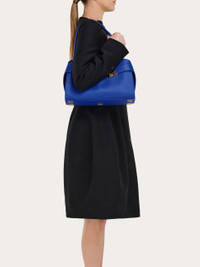 A harmonious blend of clean lines and distinctive accents define this take on the iconic Hug. The Soft Hug bag by Ferragamo, an intriguing silhouette cut from smooth calfskin with striking two tone details. Golden hardware confirms its high end status. Removable shoulder strap. - A) Height 10.0 IN B) Length 13.3 IN C) Width 6.1 IN - Composition: calfskin - Handle drop: 7.2 in/18,5 cm - Medium - Made in ITALY - Product code: 219816 783841
