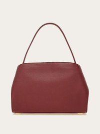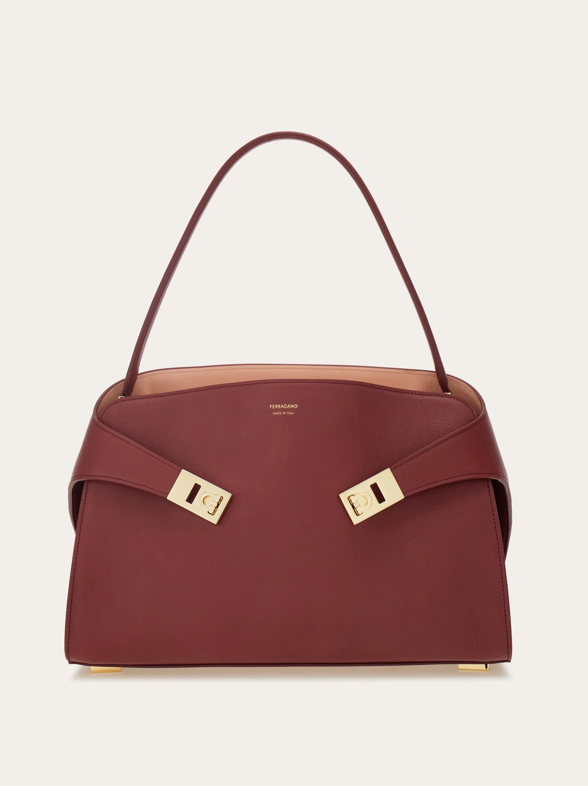 A harmonious blend of clean lines and distinctive accents define this take on the iconic Hug. The Soft Hug bag by Ferragamo, an intriguing silhouette cut from smooth calfskin with striking two tone details. Golden hardware confirms its high end status. Removable shoulder strap. - A) Height 10.0 IN B) Length 13.3 IN C) Width 6.1 IN - Composition: calfskin - Handle drop: 7.2 in/18,5 cm - Medium - Made in ITALY - Product code: 219816 783840