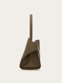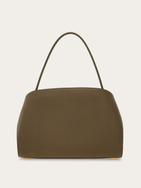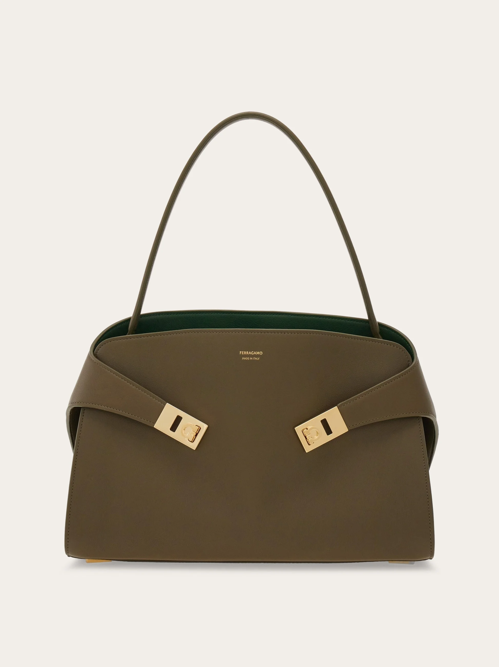 The Hug Soft shoulder bag features the distinctive enveloping shape of the Hug in a deconstructed version. Made of calfskin it features a single handle for a softer silhouette on the front panel, which is decorated with golden Gancini buckles. Closed with an internal flap equipped with magnets and a practical T-bar, this version features a contrasting lining for a refined color block effect. The central zipped compartment divides the interior into perfectly organized sections. Adjustable and detachable strap for multiple styling options. - A) Height 10.0 IN B) Length 13.3 IN C) Width 6.1 IN - Composition: calfskin - Handle drop: 7.2 in/18,5 cm - Medium - Made in ITALY - Product code: 219816 780593
