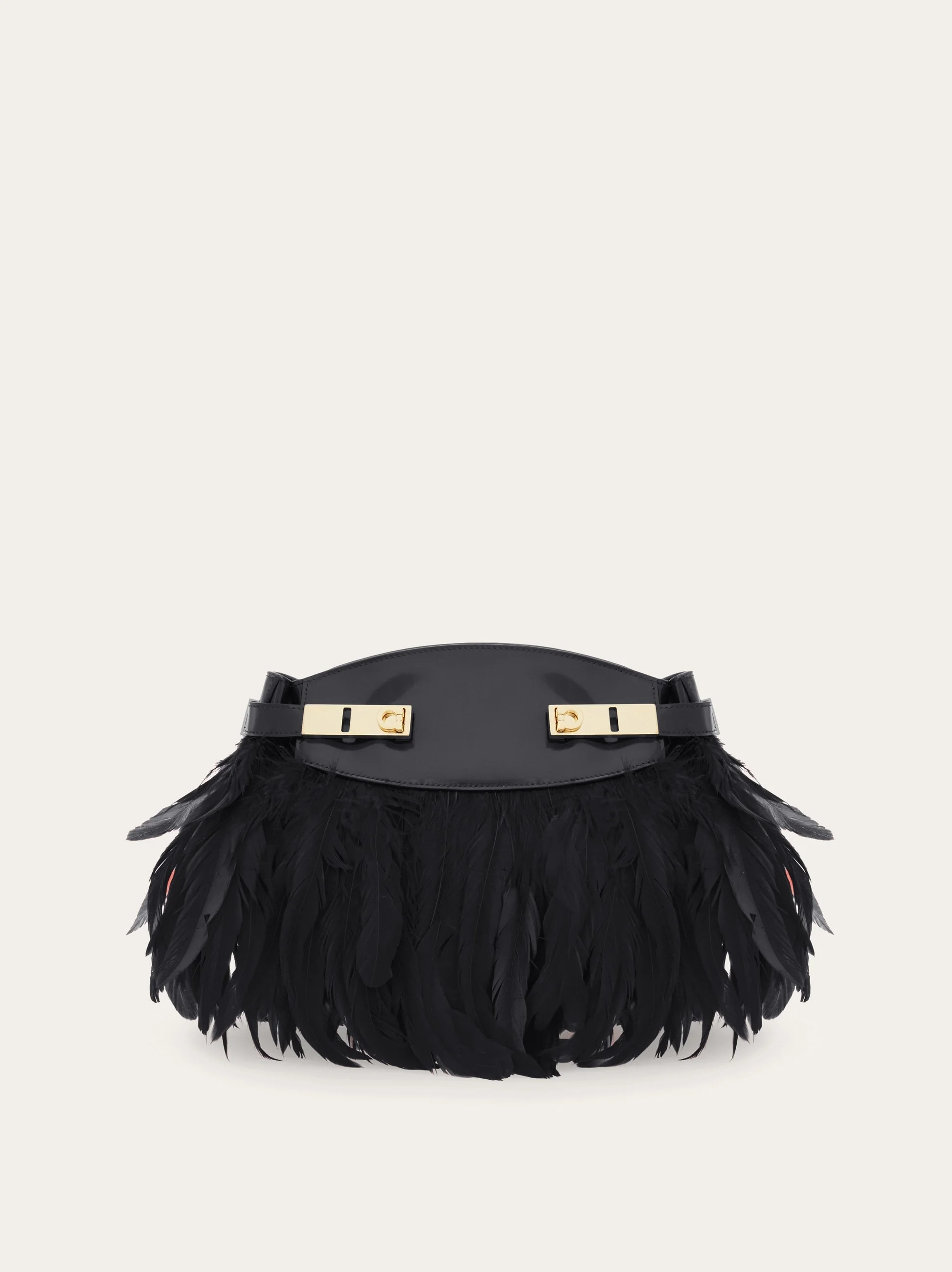 Sumptuously soft with an elegant flounce, the Ferragamo Hug, perfect for cocktail hour. Made from a combination of vegetable dyed calfskin and ostrich feathers, both printed and applied by hand, this precious accessory is the last word in high octane glamour. The soft silhouette is cinched at the sides by slim straps that ‘Hug’ the body and fasten at the front with golden Gancini buckles. A magnetic clasp opens to an organized interior with two card slots, and a removable shoulder strap offers a hands free option. - A) Height 5.9 IN B) Length 9.4 IN C) Width 4.7 IN - Composition: calfskin leather and ostrich feathers - Extra Small - Made in ITALY - Product code: 219842 787959