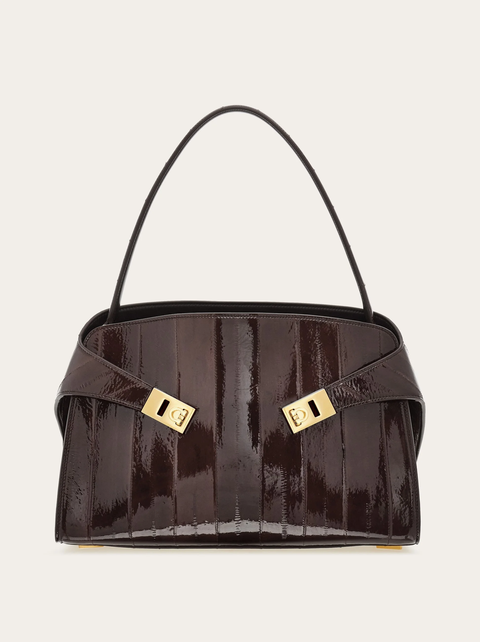 A harmonious blend of clean lines and distinctive accents define this take on the iconic Hug. The soft Hug bag by Ferragamo, an intriguing silhouette cut from luxurious eel leather with golden hardware and a fully organized interior with central zip. Adjustable, removable shoulder strap. - A) Height 10.0 IN B) Length 13.3 IN C) Width 6.1 IN - Composition: eel leather - Handle drop: 7.2 in/18,5 cm - Medium - Made in ITALY - Product code: 219816 788631