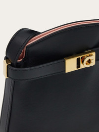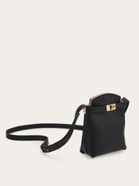 Designed as a micro bag, this smartphone holder combines elegance with a feminine touch, ensuring full functionality. Crafted in smooth calfskin, it features a contrasting interior with slots for cards and badges. It fastens with a magnetic button, has an adjustable shoulder strap, and a band with a golden Gancini buckle along the edge. - height 7.4 IN length 5.9 IN width 2.5 IN - Composition: calfskin - 3 card slots, 1 compartment - Made in ITALY - Product code: 220650 770888