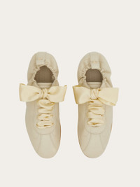 A sporty shoe with a feminine flair, this new Ferragamo sneaker is an innovative hybrid of a classic trainer and a ballet flat. Cut from buttery soft nappa leather, the upper is laced up with a large satin bow for a romantic twist. A golden Gancio is placed on the heel tab, and the slim rubber sole features a custom tread. - Composition: nappa - Made in ITALY - Product code: 030651 778967