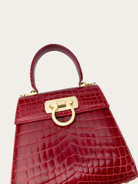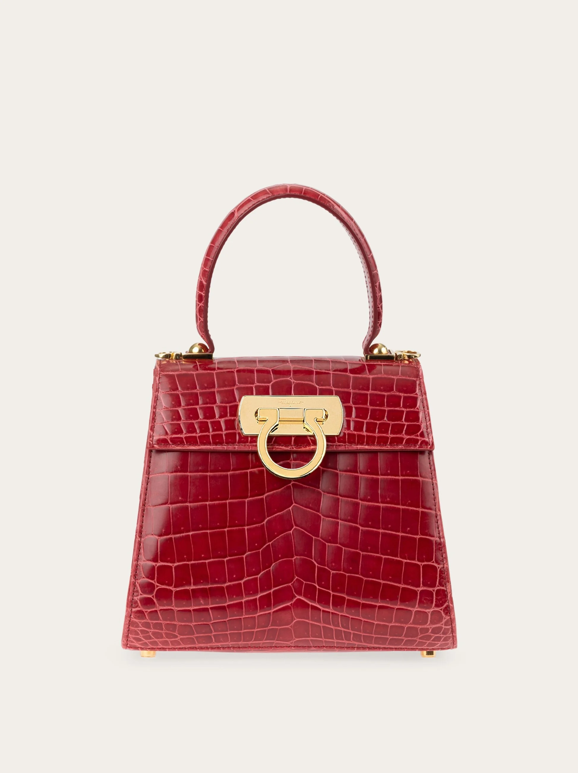 A petite top-handle bag in crocodile, finished with a gold-tone Gancini closure. A reissue of one of Ferragamo’s most iconic designs, the Iconic Top Handle captures the multifaceted essence of femininity. Its perfectly versatile proportions make it ideal for any occasion, cementing its status as a symbol of Ferragamo style—distinctive, timeless, and as unique as the woman who carries it. - A) Height 7.0 IN B) Length 8.0 IN C) Width 3.9 IN - Composition: alligator - Handle drop: 3.9 in/10 cm - Made in ITALY - Product code: 212270 641069